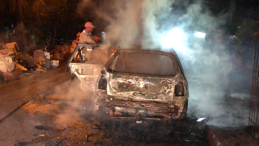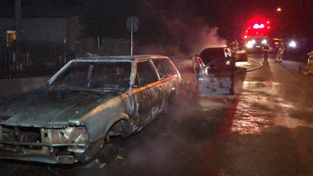 Três carros foram consumidos pelas chamas e um ficou parcialmente destruído em um incêndio criminoso. No local, um homem acabou sendo alvejado por disparos de arma calibre 12.