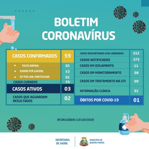 O município de Quatro Pontes tem três casos ativos de Covid-19, segundo dados do Boletim Coronavírus atualizado nesta terça-feira (13). 55 pessoas já se recuperaram da doença, e dois suspeitos ainda aguardam resultado do exame.