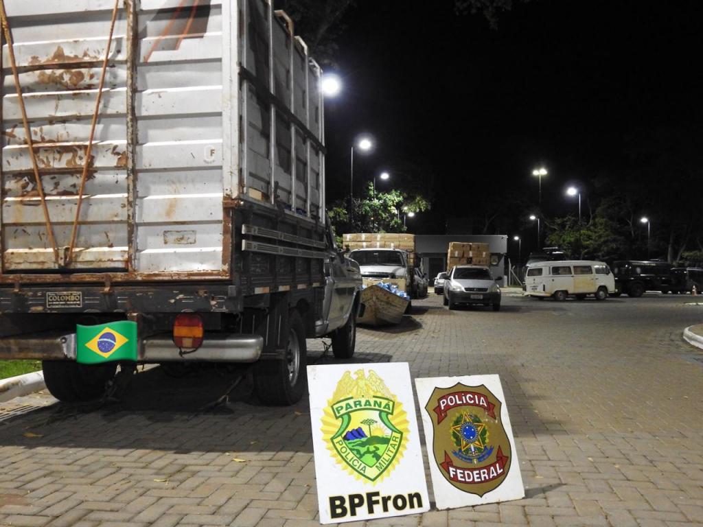 No local foram apreendidos 01 caminhão, 02 caminhonetes e 01 veículo carregado com aproximadamente 400 caixas de cigarros contrabandeados, prejuízo de aproximadamente R$ 550.000,00 ao crime organizado da região.