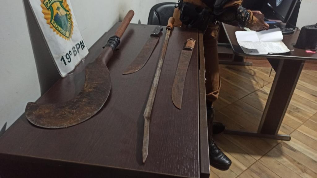 Os policiais, localizaram o acusado alterado em sua residência, um pino que geralmente armazena cocaína foi encontrado na casa, o rapaz também estava com dois facões, uma foice e um espeto, ele foi algemado e encaminhado para a delegacia de polícia civil em Toledo.