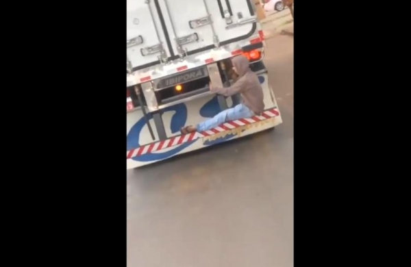 Imagens foram registradas no final de semana onde mostram um rapaz pegando carona sentado em um para-choque de uma carreta baú frigorífico que transitava pela rodovia PR-182 sentido a Palotina.