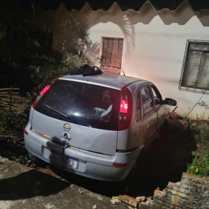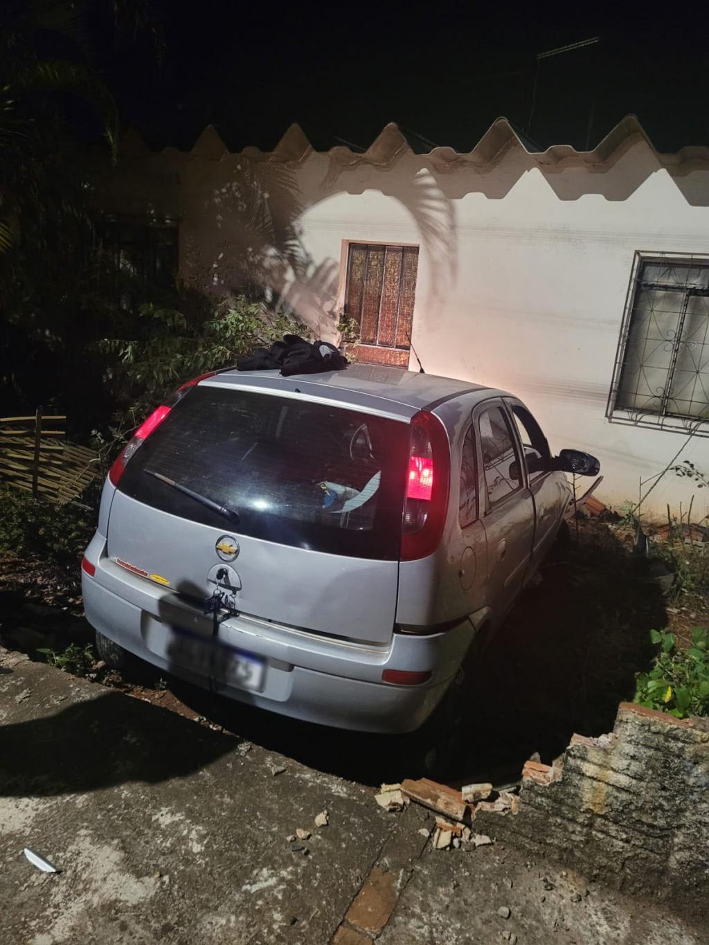 Durante perseguição o condutor do carro em fuga quebrou o retrovisor de um veículo Uno estacionado e parou somente quando colidiu com um muro de uma residência, invadindo o quintal localizado no cruzamento da rua da Igreja com a rua Laguna, marcas frenagem de aproximadamente 20 metros ficaram gravadas no asfalto.