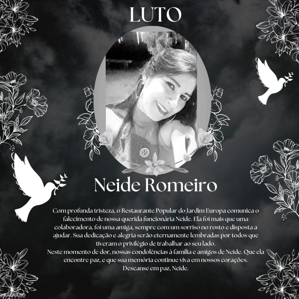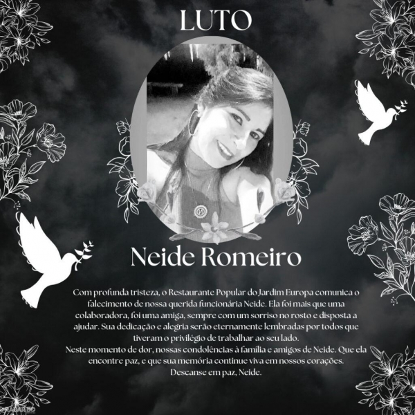 “Com profunda tristeza, o Restaurante Popular do Jardim Europa comunica o falecimento de nossa querida funcionária Neide. Ela foi mais que uma colaboradora, foi uma amiga, sempre com um sorriso no rosto e disposta a ajudar. Sua dedicação e alegria serão eternamente lembradas por todos que tiveram o privilégio de trabalhar ao seu lado”, diz a nota.