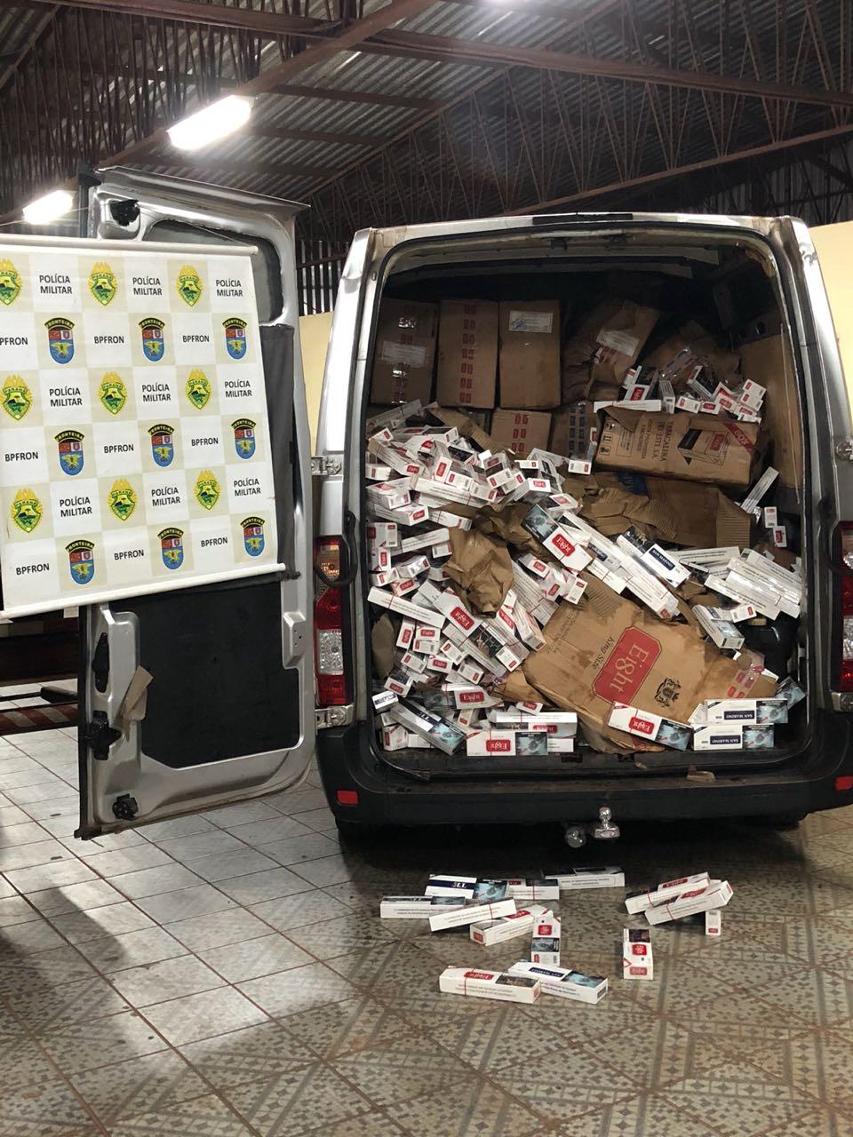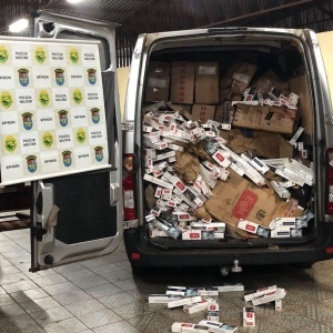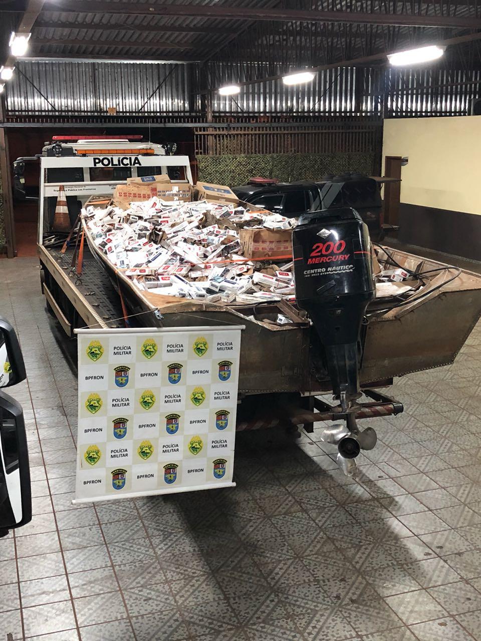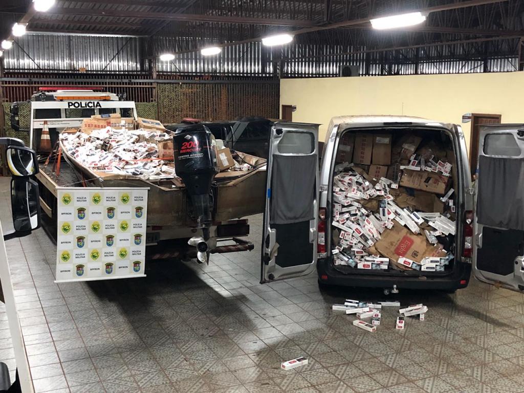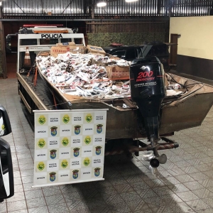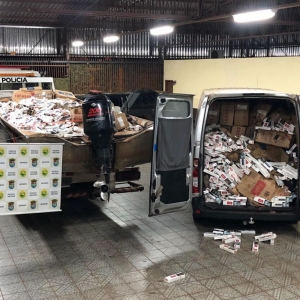 Já na madrugada de hoje (29) uma grande apreensão foi registrada pelo C.O.B.R.A. - Corpo de Operações de Busca e Repressão Aquática. Em patrulhamento embarcado no lago de Itaipu na cidade de Mercedes - PR, os policiais militares visualizaram uma embarcação com cerca de dez metros, popularmente conhecida como gala. O condutor da embarcação se aproximava da margem brasileira quando foi abordado. Foram encontradas diversas caixas de cigarros contrabandeados do país vizinho. Na margem brasileira, um veículo Master aguardava a chegada da embarcação, também com cigarros em seu interior. Nela foram encontrados também um rádio comunicador. No total foram apreendidos 150 caixas de cigarros nessa ocorrência. O condutor da embarcação foi encaminhado aos procedimentos juntamente com embarcação, veículo e contrabando apreendidos.