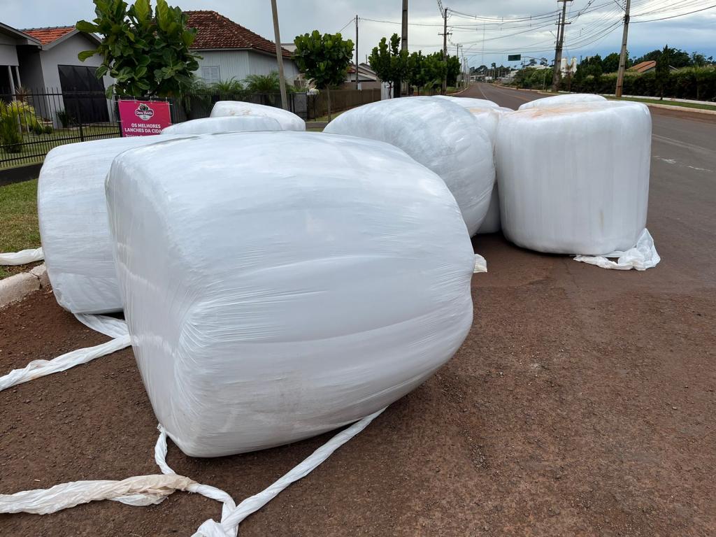 Dez rolos de feno ficaram espalhados pela avenida Horizontina, saída para Novo Sarandi, nas proximidades da Praça do Colonizador em Nova Santa Rosa.