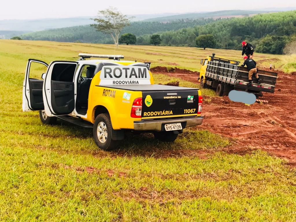 Por volta das 08h50 desta segunda-feira (18), quando em deslocamento pela PRC 272 sentido Iporã a Francisco Alves nas proximidades do Km 518, a equipe de serviço da ROTAM visualizou um caminhão de cor amarela, entrando em uma estrada rural.