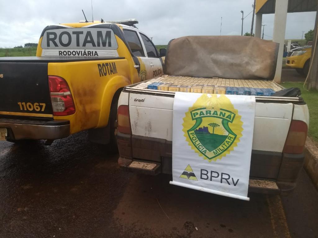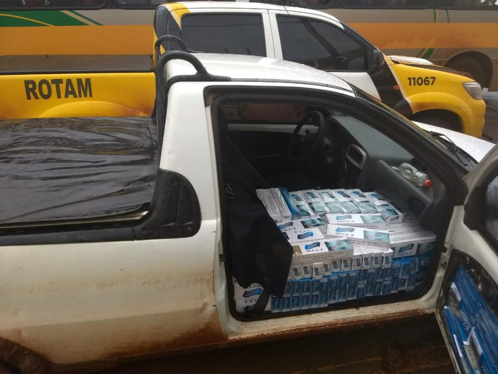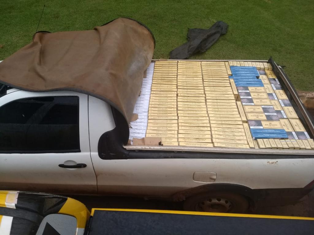 Durante revista foram localizados na caçamba e interior da caminhonete cerca de 16.000 maços de cigarros contrabandeados do Paraguai.