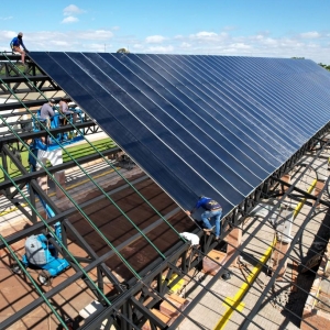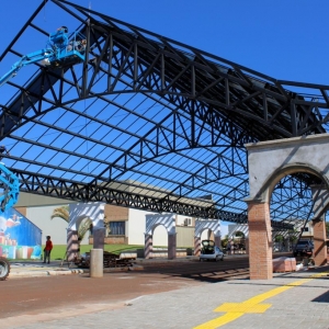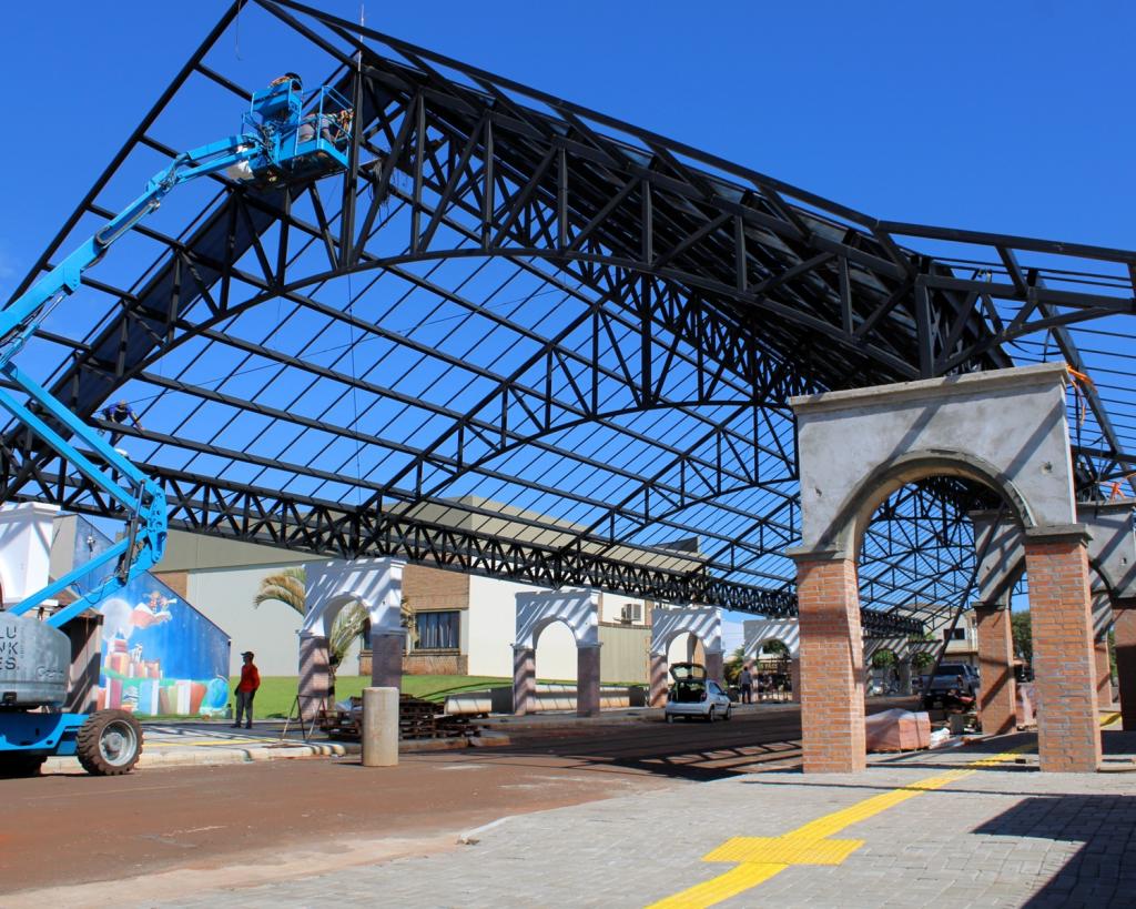 A construção da Rua Coberta de Mercedes avança para a fase final e já ultrapassa 70% de execução. Neste momento, os trabalhos estão concentrados na instalação do telhado, que será feito com policarbonato alveolar fumê, material capaz de reter até 80% da incidência solar, proporcionando maior conforto térmico ao espaço.