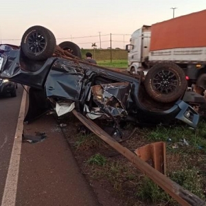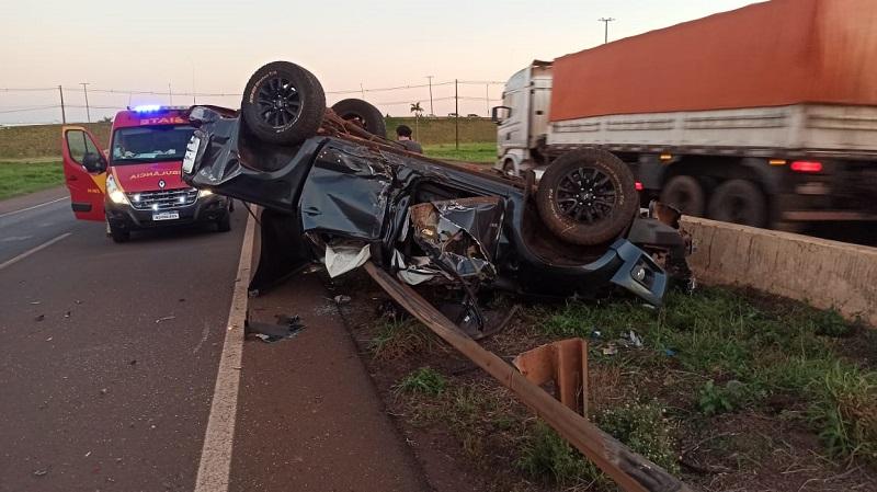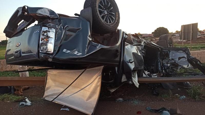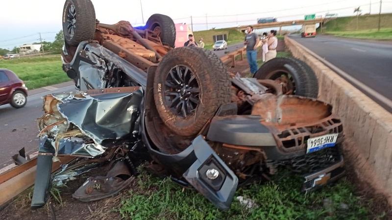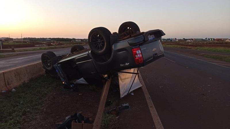 A Chevrolet S10 com placas Mercosul ocupada pelo motorista sua namorada e uma amiga do casal além de uma cachorra capotou no final da tarde de sexta-feira na rodovia BR 163, próximo ao viaduto com a avenida Parigot de Souza em Toledo.