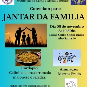 Neste sábado, dia 08 de novembro, acontece mais uma edição do Jantar da Família, promovido pelas Escolas Estadual Vinícius de Moraes e Municipal Arnaldo Busato, de Alto Santa Fé. O evento será no Clube Social União, a partir das 19h30.