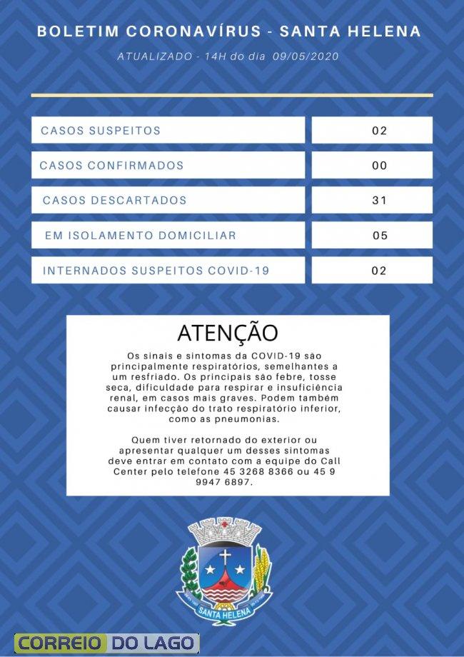 A Secretaria Municipal de Saúde vem a público informar que até às 14h deste sábado (09), Santa Helena conta com dois casos suspeitos de coronavírus. Os dois pacientes estão internados, com estado de saúde estável e sendo monitorados pela equipe médica.