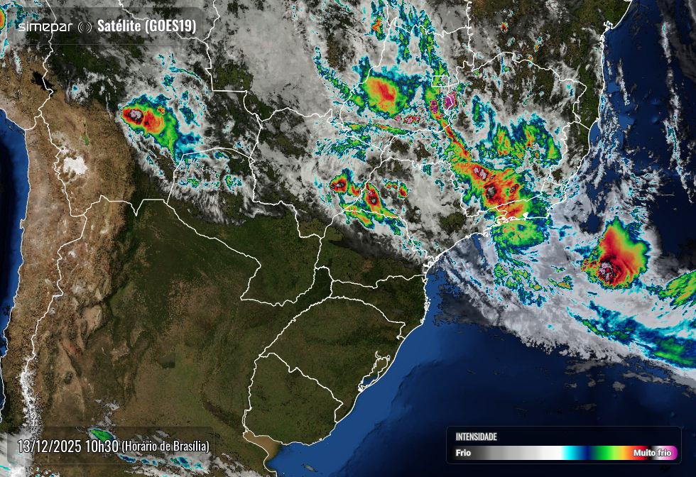 A imagem mais recente do satélite GOES-19, analisada na manhã deste sábado (13), aponta um cenário de forte instabilidade atmosférica sobre o Paraná, com destaque para as regiões Oeste, Sudoeste e parte do Noroeste do Estado. As áreas em tons mais intensos nas imagens indicam nuvens com grande desenvolvimento vertical, associadas a chuva volumosa e temporais.