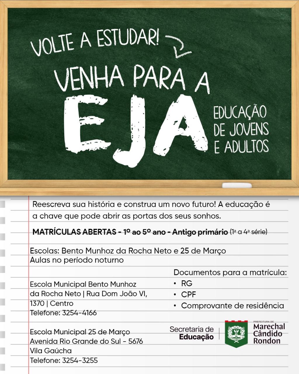 A Secretaria Municipal de Educação de Marechal Cândido Rondon informa que ainda há vagas abertas para a Educação de Jovens e Adultos (EJA) no ano letivo de 2026. A modalidade é destinada a pessoas que não concluíram o Ensino Fundamental - do 1º ao 5º ano (antigo primário, correspondente à 1ª a 4ª série) – e que desejam retomar os estudos. As aulas serão ofertadas no período noturno, proporcionando mais comodidade, especialmente para quem trabalha durante o dia.
