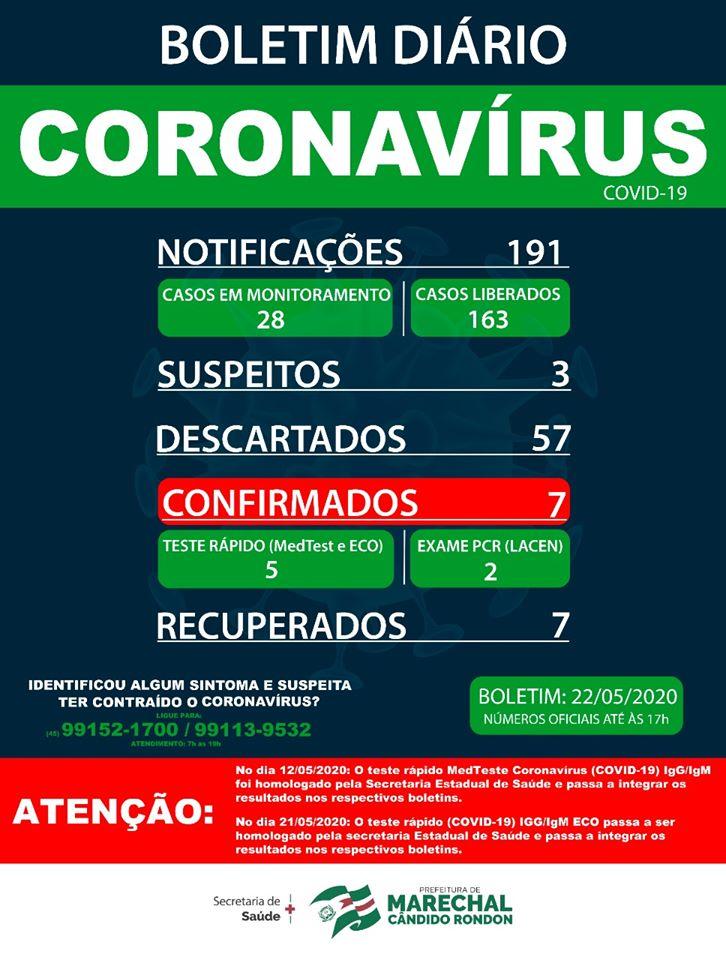 No final da tarde desta sexta-feira (22), o departamento de Vigilância Epidemiológica de Marechal Cândido Rondon divulgou boletim onde consta a confirmação de um total de 7 casos de coronavírus no município. Até ontem (21) eram apenas 3 casos confirmados na cidade.