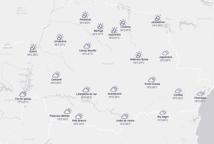 Para Nova Santa Rosa, Marechal Rondon e Palotina, segundo Simepar, as temperaturas ficam entre 16°C e 29°C.