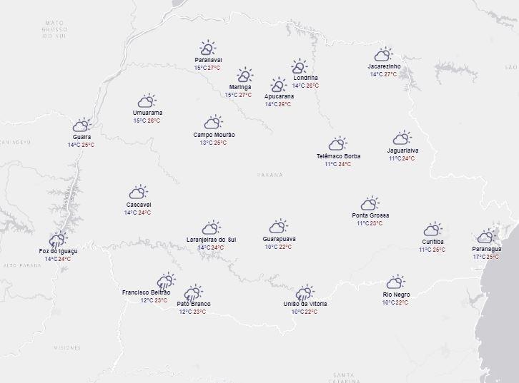 Para Nova Santa Rosa e Marechal Cândido Rondon a máxima é de 25°C e a mínima de 14°C.