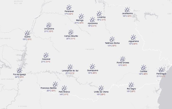 Já em Guarapuava, no Centro-sul, a temperatura fica um pouco mais amena, com a mínima na casa do 15ºC e a máxima não passando dos 25ºC.
