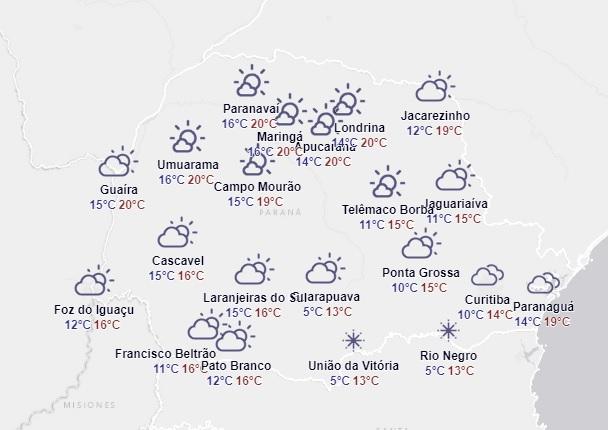 O dia inicia muito frio na maioria das regiões paranaenses. Porém, áreas de instabilidade se desenvolvem entre o Paraguai e o oeste do Paraná e evoluem rapidamente para as demais regiões do Estado. Por isso, as chuvas voltam a ser registradas na metade norte, Campos Gerais e Leste.
