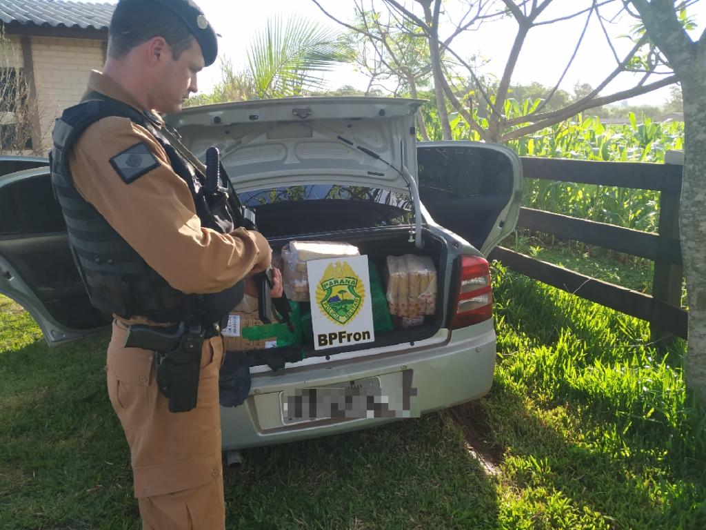 Na segunda feira (05/11) Policiais Militares do BPFron realizavam patrulhamento na cidade de Santa Helena - PR quando visualizaram um veículo Astra de cor prata. Ao iniciarem procedimentos de abordagem o condutor do veículo empreendeu fuga, dando início a um acompanhamento tático que se findou depois de alguns quilômetros quando o condutor abandonou o veículo e empreendeu fuga em meio a plantação local, não sendo localizado. No veículo com placas de Balneário Piçarras - SC foram encontrados diversos tabletes de substância similar à maconha que após pesados totalizaram 338 kg. Ainda foi localizado uma caixa contendo 42 kg de veneno agrícola contrabandeado do Paraguai. Veículo, entorpecente e veneno foram encaminhados aos procedimentos legais cabíveis.