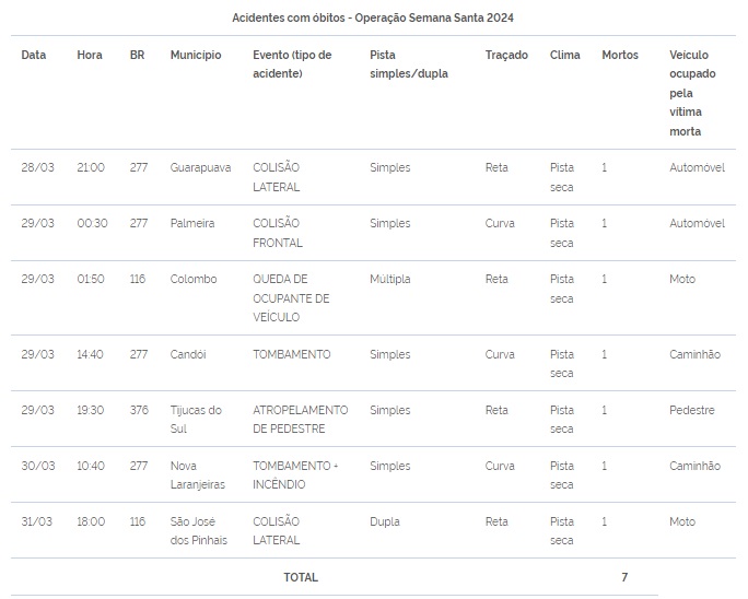 Durante o período, a PRF registrou sete mortes em sinistros de trânsito nas rodovias federais do Paraná durante a Operação Semana Santa.