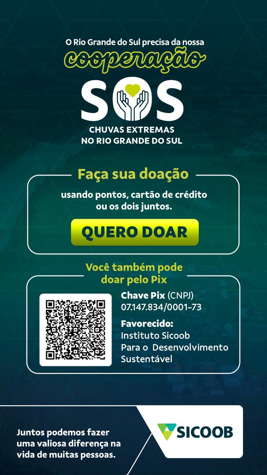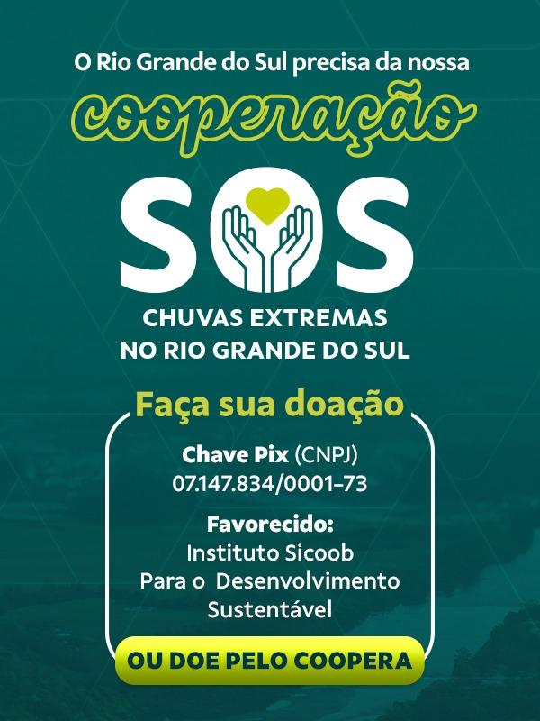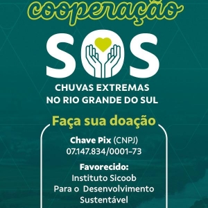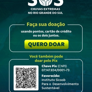 - Doações- Além desse conjunto de ações em favor dos cooperados, o Sicoob está realizando campanha de arrecadação de recursos financeiros, a SOS RIO GRANDE DO SUL, que já mobilizou mais de R$ 2 milhões até o fechamento dessa matéria. E para cada R$1 doado será adicionado R$1 pelo Sicoob, até o montante de R$10 milhões.