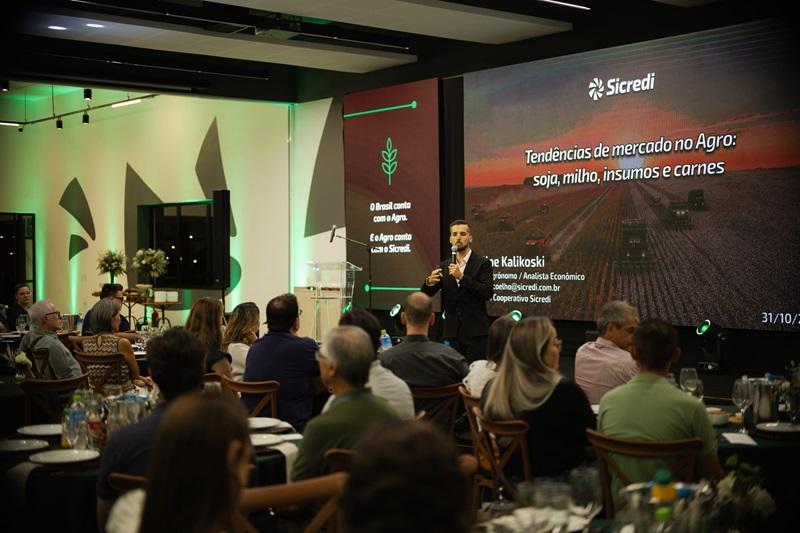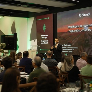Em sua palestra, o analista econômico do Banco Cooperativo Sicredi, Filipe Kalikoski, destacou que o agronegócio é movido por diversos cenários e nem sempre o fator externo é de domínio do produto rural.