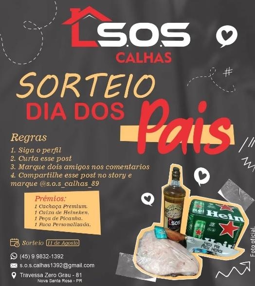 Em comemoração ao dia dos pais no mês de agosto a S.O.S Calhas de Nova Santa Rosa resolveu fazer um mega sorteio, as regras são bem simples.