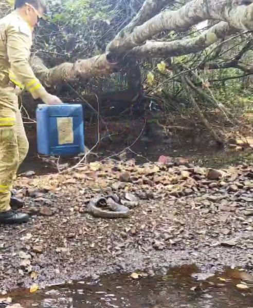 A sucuri media cerca de 2,5 metros e foi solta distante da cidade, em um riacho na mata, habitat natural da sucuri.