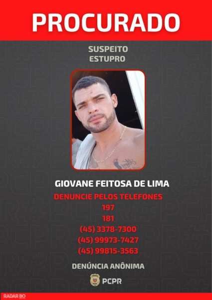 A Polícia Civil do Paraná (PCPR) divulga foto de um homem foragido por estupro contra mulher, de 27. O crime aconteceu em Toledo, na região Oeste do Estado.