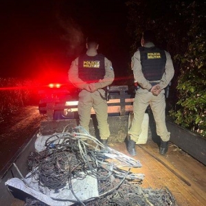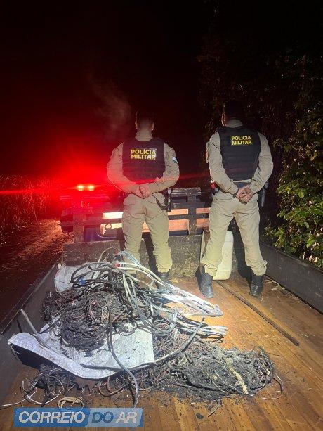 Durante patrulhamento na zona rural de Palotina, a Polícia Militar flagrou dois indivíduos queimando fios em uma via pública. Conforme relato da equipe, os cabos aparentavam ser utilizados em sistemas de placas solares, o que levantou suspeitas de furto.