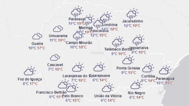 As temperaturas despencaram nas últimas horas. Em Cascavel, a segunda-feira (9) começou com 7,3 ºC e máxima durante o dia é esperada na casa dos 16ºC. Na terça-feira (9), o frio será mais intenso e os termômetros devem registrar 4ºC. O tempo na capital do Oeste permanece nublado e sem previsão de chuva, segundo o Simepar.