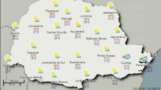 Hoje faz 32ºC em Cascavel, 34ºC em Foz do Iguaçu, 33ºC em Maringá, 32ºC Londrina e 31ºC em Curitiba.