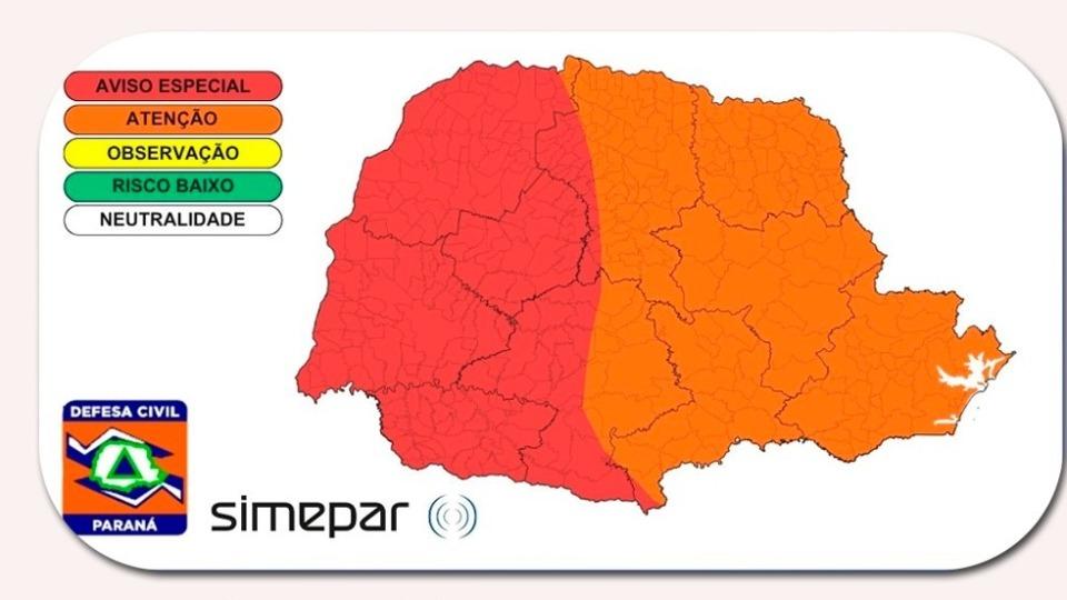 A atualização da previsão indica risco muito alto na metade Oeste do Estado e risco alto na metade Leste para ocorrências meteorológicas associadas à tempestades severas e chuva localmente intensa, com acumulados que podem ultrapassar pontualmente os 50 mm, descargas elétricas, intensas rajadas de vento pontualmente acima dos 80 km/h e precipitação de granizo pontual.