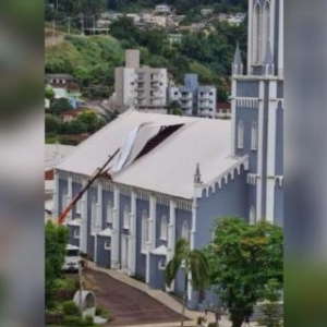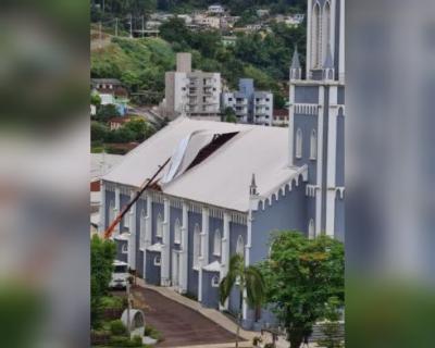 Em Itapiranga, no Extremo-Oeste, a igreja matriz no centro da cidade teve parte do telhado arrancado na tarde de quarta-feira (2) durante o temporal.