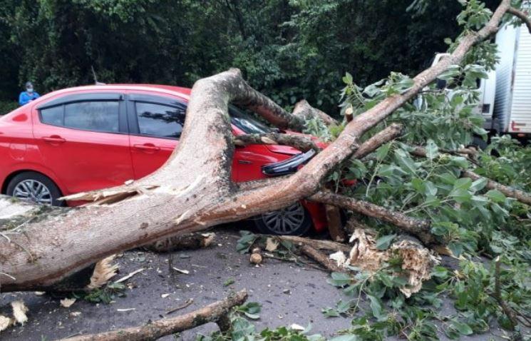 Uma árvore caiu e atingiu um carro e um caminhão na manhã desta quinta-feira (3) na SC-150, em Lacerdópolis, no Meio-Oeste. Um Fiat Cronos, placas de Capinzal, foi atingido no para-brisa e capô. Também ficou danificado um Ford Cargo, placas Fraiburgo que se deslocava em direção a Ouro.