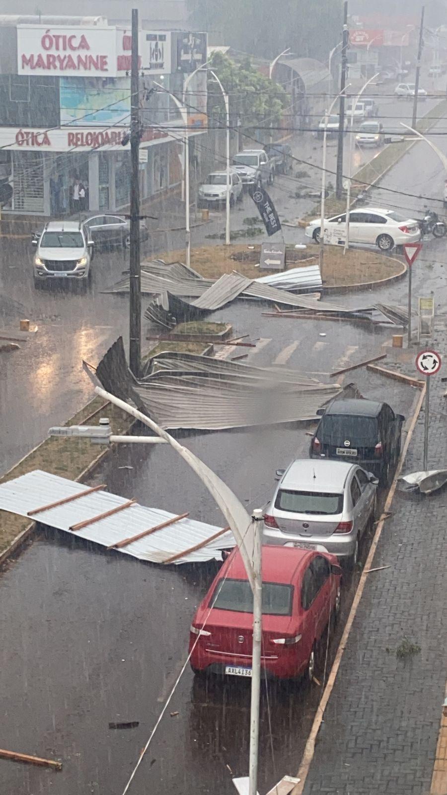 Diversas residências e estabelecimentos comerciais tiveram telhas e toldos de aço arrancados que ficaram espalhados pelas ruas. A força do vento também derrubou diversas árvores.