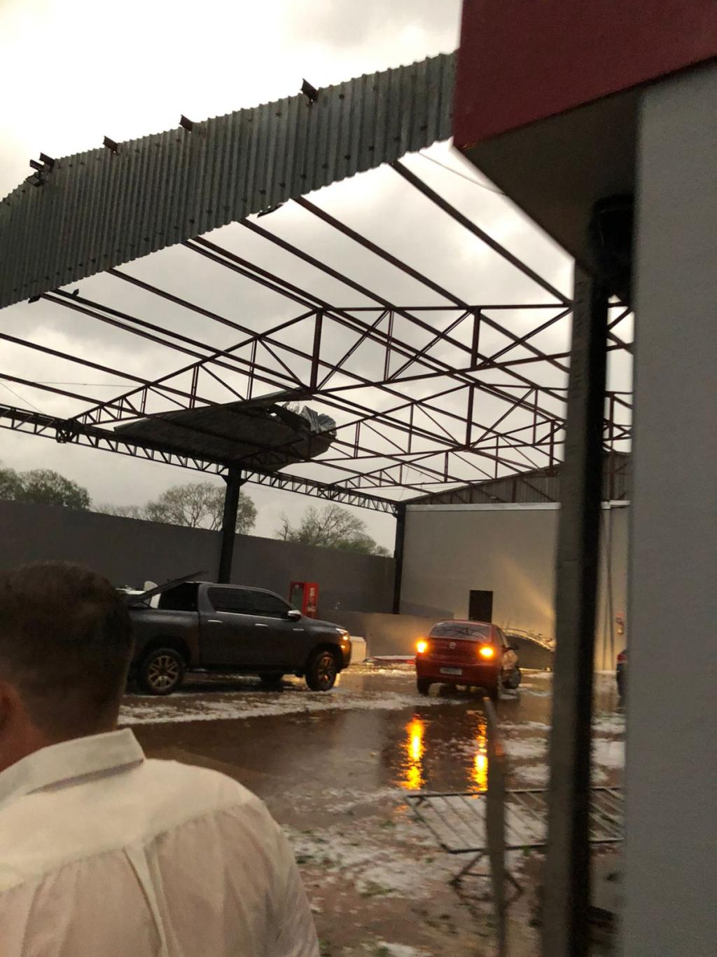 Um veículo novo de uma revendedora de Palotina ficou embaixo da estrutura metálica que caiu com o temporal, danificando o carro que seria exposto a partir da noite de hoje.