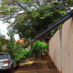 Uma árvore de grande porte também caiu e atingiu o poste do padrão Copel que conduz energia para um prédio de moradia, um veículo Volkswagen Gol que estava estacionado em frente ao prédio foi atingido.