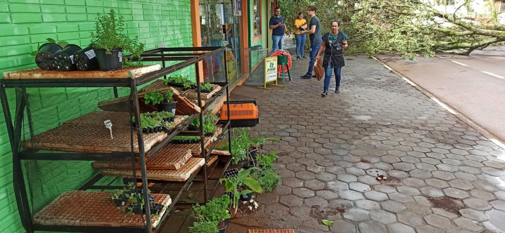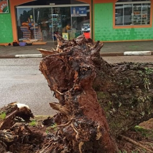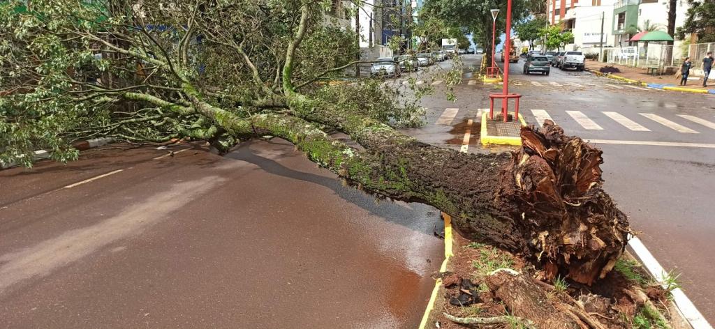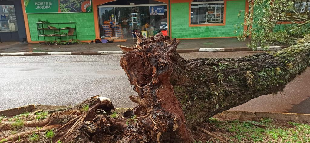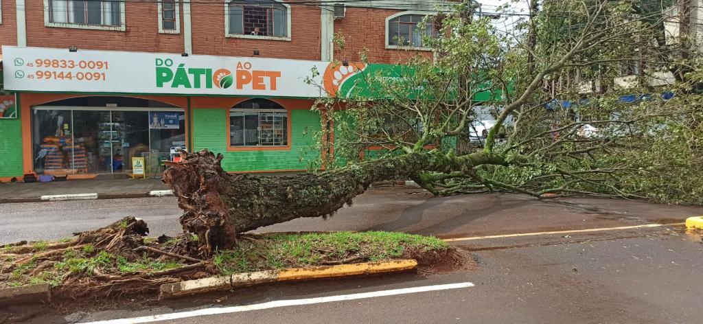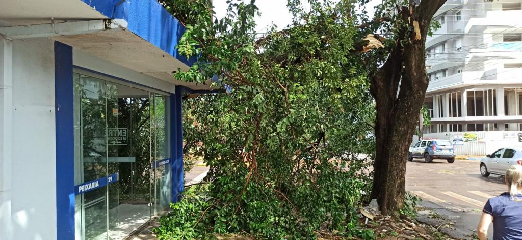 Na avenida Maripá uma árvore de grande porte caiu interditando uma das pistas, a fachada de um comércio de petshop foi atingida por galhos de árvores e teve prejuízos.