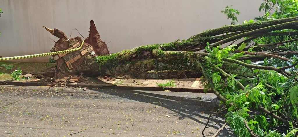 Árvores caíram com a força dos ventos, na área central e também na região do lago municipal.