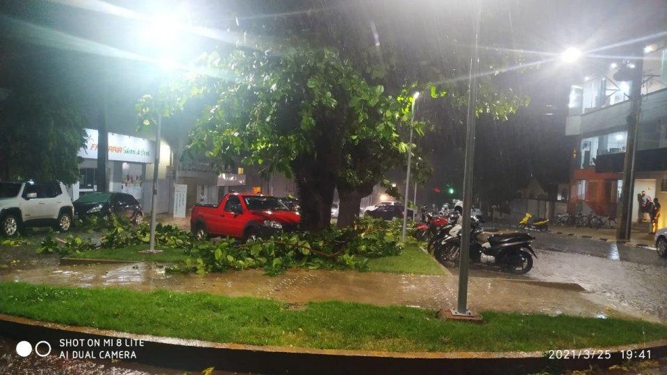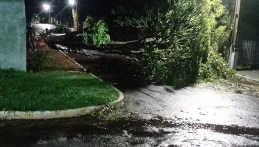 Temporal deixou estragos no município de Ubiratã na noite desta quinta-feira (25). Vídeos enviados por internautas à Catve mostram partes do forro de posto de combustíveis arrancadas pela força do vento e árvores caídas.