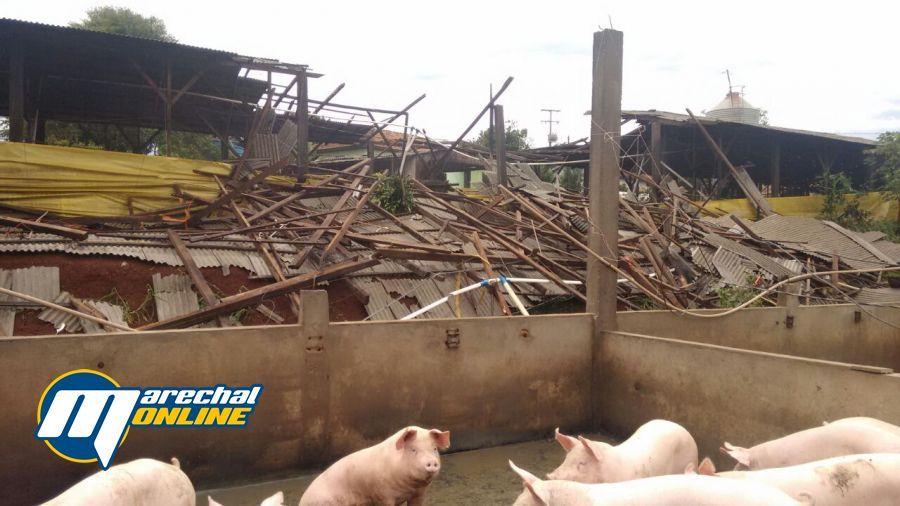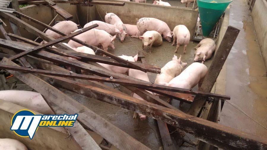 Segundo informações repassadas para nossa equipe, à força do vento derrubou dois chiqueiros, onde estavam cerca de 1750 suínos, matando apenas um animal.