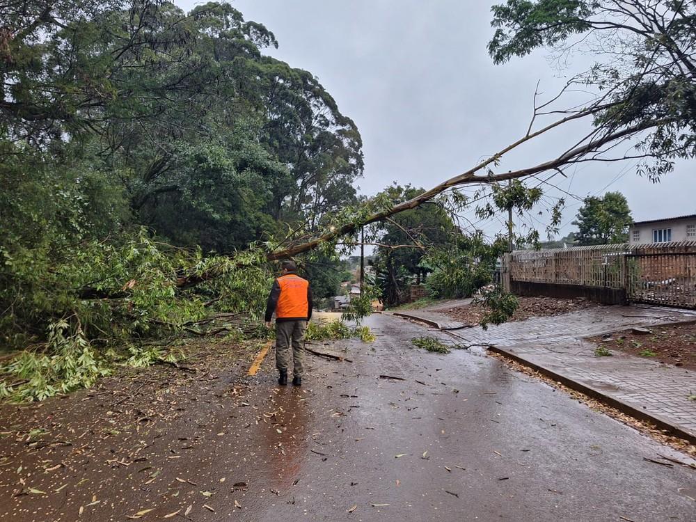 Em Cascavel, no Oeste, um eucalipto caiu sobre a rede elétrica. Ninguém ficou ferido.