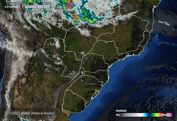 A terça-feira (11) amanheceu com tempo firme em praticamente todo o Sul do Brasil, segundo imagem de satélite do GOES-19 das 6h, divulgada pelo Simepar. O céu claro e o predomínio do sol marcam o início do dia em todas as regiões paranaenses, especialmente no Oeste e na faixa de fronteira com o Paraguai.