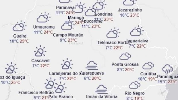 Em Curitiba, por exemplo, a mínima hoje é de 10ºC e a máxima de 19ºC. Deslocando para a região Norte do estado, em Apucarana e Londrina, a mínima é de 11ºC e máxima de 23ºC.