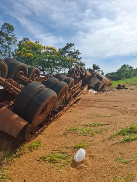 Um caminhão carregado com soja a granel se envolveu em um tombamento na manhã de segunda-feira (22), na rodovia PR-488, no trecho entre Diamante do Oeste e Santa Helena, no Oeste do Paraná.