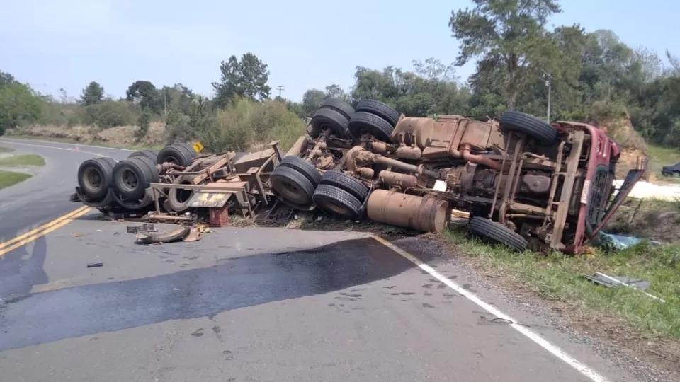 A carreta, uma DAF vermelha com placas de Concórdia, atravessou a pista, causando interrupção do tráfego.