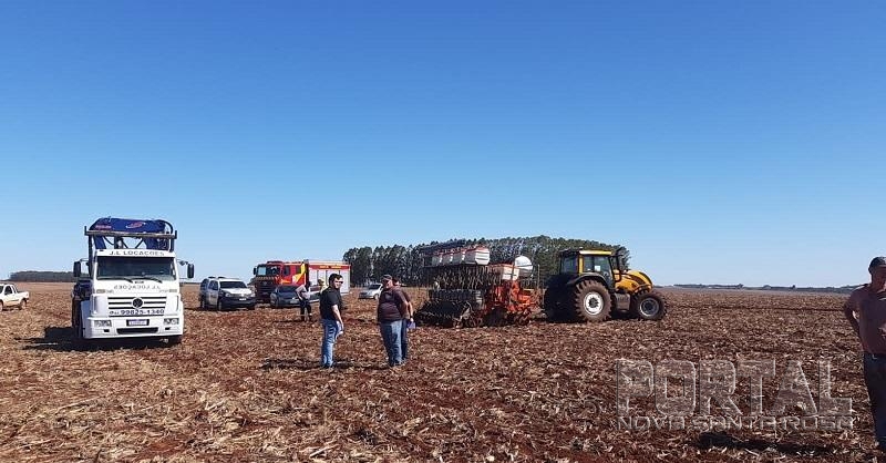 O Corpo de Bombeiros foi acionado as 13h37 de deslocou até uma plantação, pois as primeiras informações, davam conta que uma pessoa havia caído de um trator, acoplado com uma plantadeira.