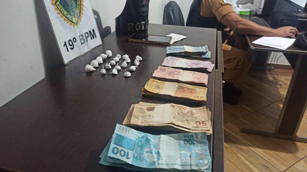 No bolso da bermuda do traficante foi localizado R$ 2,524,00 em diversas notas, no porta luvas do carro foi encontrado uma sacola branca pequena contendo 19 porções de cocaína pronta para comercialização, totalizando 23,1 gramas.