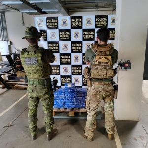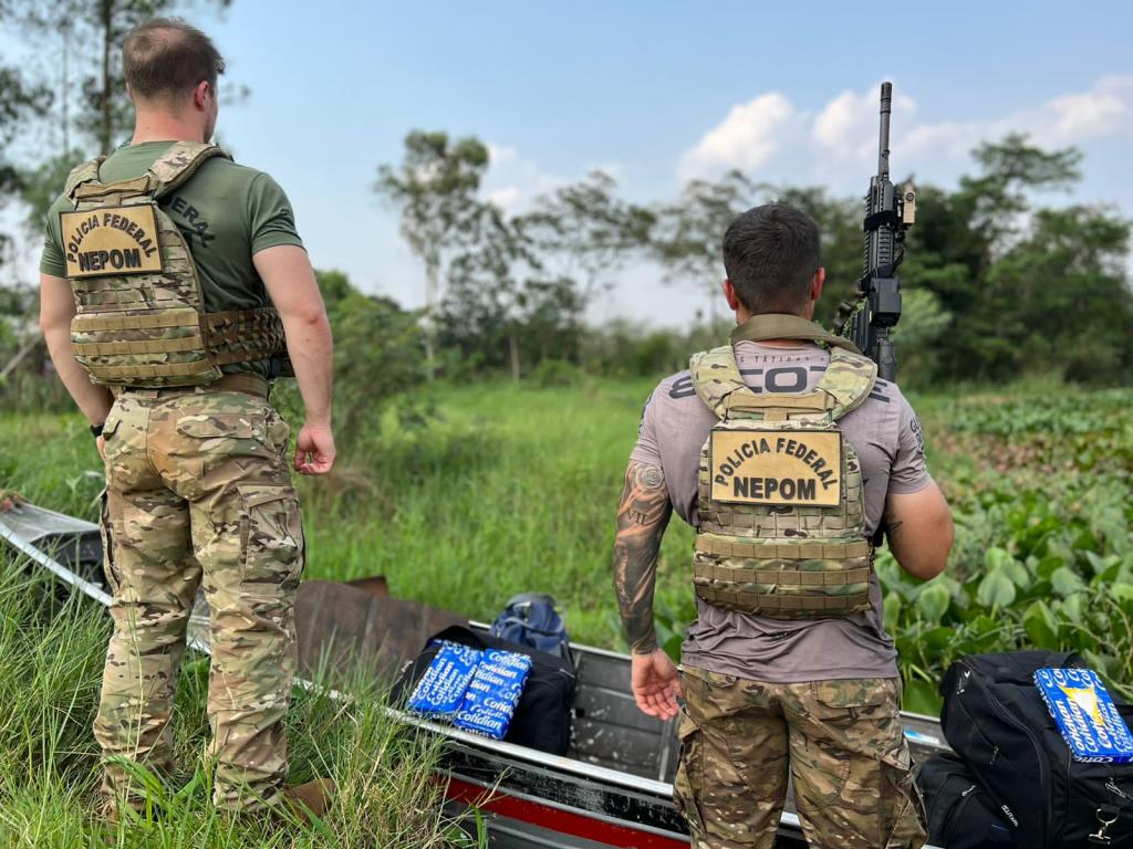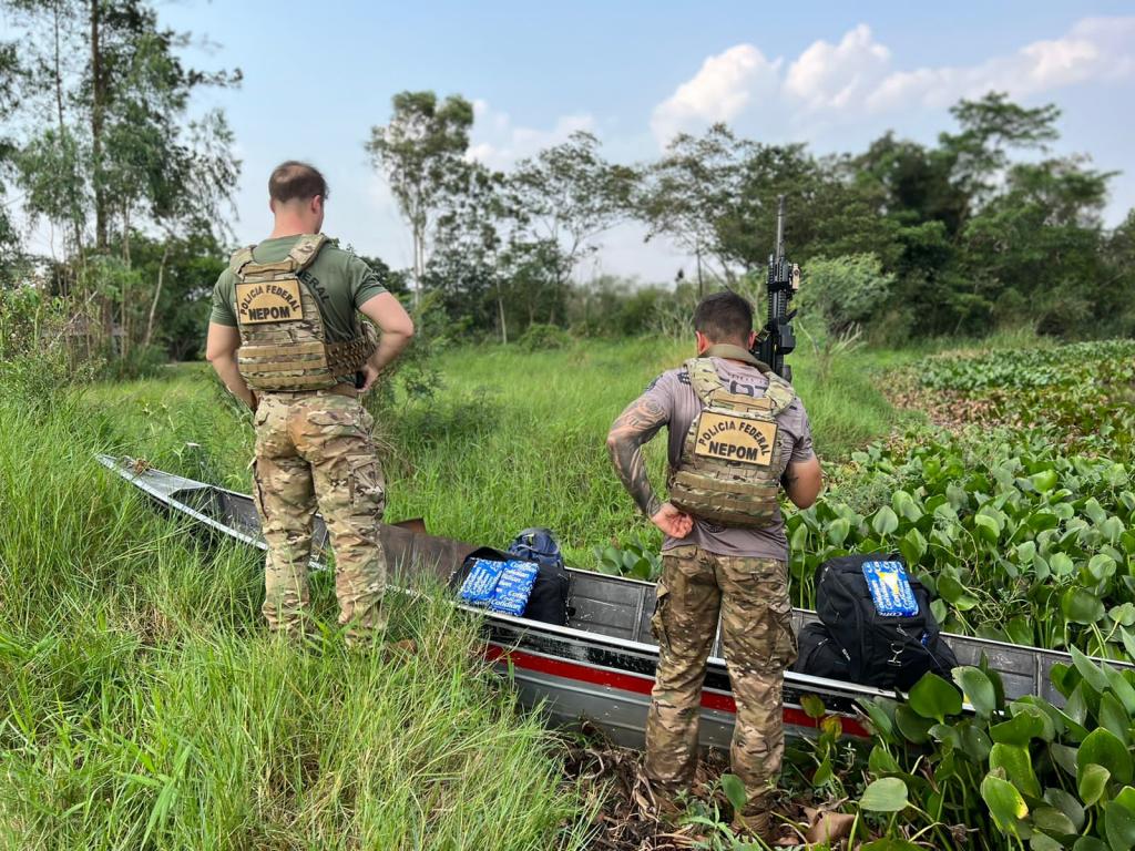 Um dos ocupantes foi detido, enquanto o segundo conseguiu fugir para a mata. Na embarcação, foram encontrados 100 tabletes de cocaína, totalizando 108,5 kg após pesagem.